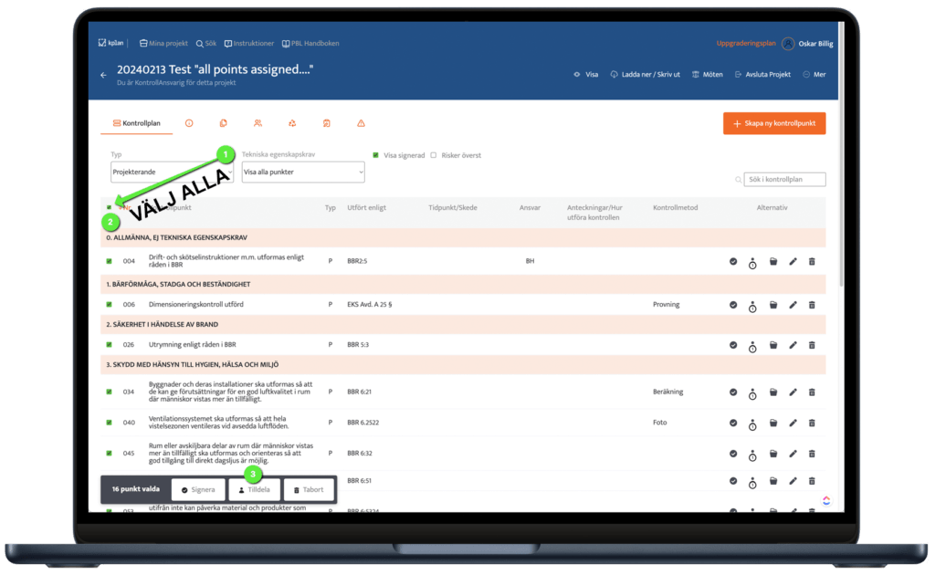 Vi har därför gjort det möjligt att filtrera punkter på Projekterande/Utförande eller tekniskt egenskapskrav, klicka “välja alla” och sedan tilldela alla dessa punkter till en person.